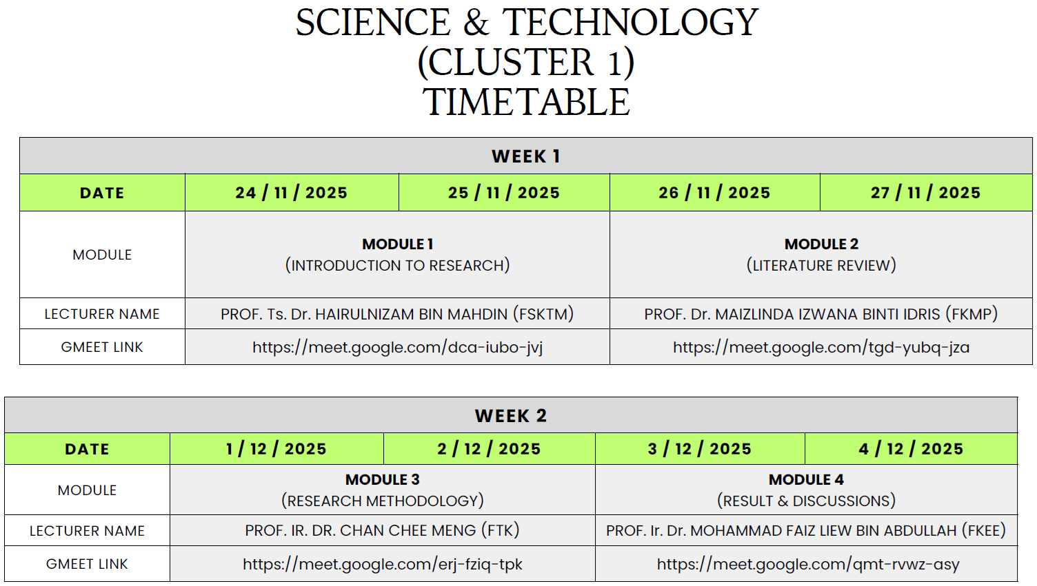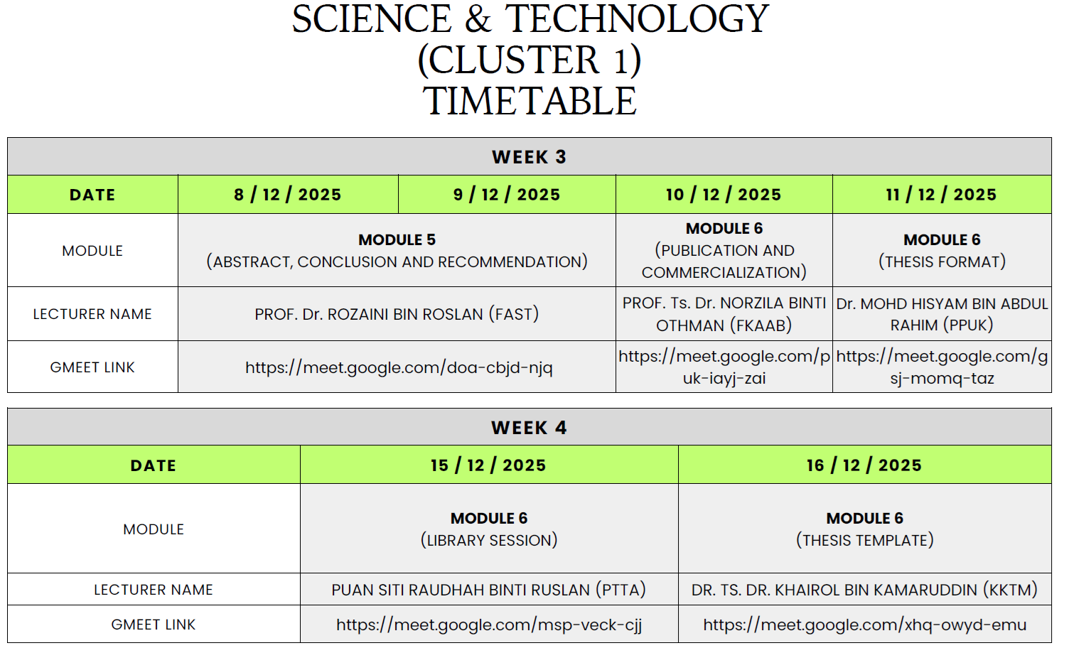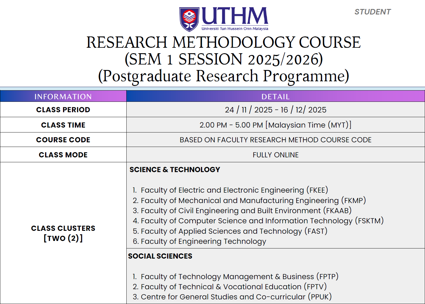 KDM10303 & PDM10303 – designated for research students, including the following programs: